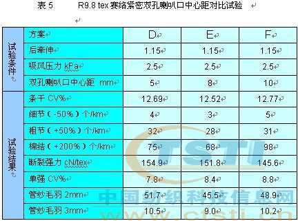 賽絡緊密紡的工藝配置是一項綜合性很強的工作,羅拉隔距、后區牽伸倍數、搖架壓力、細紗捻系數、鋼令鋼絲圈型號、雙孔喇叭口中心距、吸風壓力等,必須逐項優選。由于R9.8 tex賽絡緊密紗屬于我公司的新產品,沒有現成的經驗可循。羅拉隔距、細紗捻系數我們參考國產賽絡紡長車60支紗的經驗,確定為羅拉隔距44*63mm,捻度1088捻/米,捻系數為341;后區牽伸剛開始選用1.19倍時條干不好,后羅拉有輕微打頓現象,原因是車身較長,牽伸羅拉容易出現扭振,改為1.15后打頓現象消除,條干明顯好轉;搖架壓力:前16*中10*后12 kg,前皮輥加壓由偏心多邊塊直接調節。對于其他參數,做出如下對比試驗后優選。