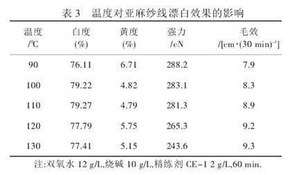 從表3可知,隨著漂白溫度的升高,亞麻紗線(xiàn)白度先升后降,黃度先降后升,強(qiáng)力依次下降.但在110℃時(shí),白度達(dá)到最大值,黃度達(dá)最小值.原因是隨漂白溫度的升高,漂白速率加快,各種雜質(zhì)分解去除的速率快,但溫度過(guò)高,易使紗線(xiàn)泛黃,強(qiáng)力損傷過(guò)大.綜合考慮,處理溫度選擇110℃.