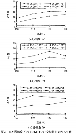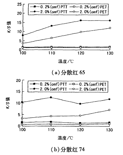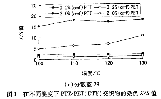 選取低溫型分散紅65、高溫型分散紅74和藍79對PTT/PET巧交織物染色,染料質量分數0.2%和2.0%,染色溫度對K/S值的影響見圖1和圖2。