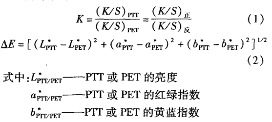 測定染色試樣正反面的表觀色深K/S值、顏色參數、D65光源和10度視角,試樣折疊四層。按式(丨)和式(2)分別計算分散染料在PTT和PET纖維上的同色平衡值K和以PET為標準時PTT和PET之間的總色差。