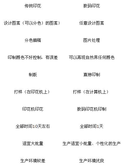 其次,數(shù)碼圖案設(shè)計(jì),必須要了解它與傳統(tǒng)圖案印花的特點(diǎn),下面把數(shù)碼印花技術(shù)與傳統(tǒng)印花技術(shù)的特點(diǎn)進(jìn)行比較: