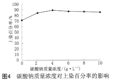 從表2可以看出,隨著碳酸鈉質量濃度的增加,蠶蛹蛋白粘膠長絲白度有稍微提高趨勢,當碳酸鈉質量濃度超過4g/L白度基本不變。由圖4可以看出,碳酸鈉質量濃度在0?2g/L時,上染百分率顯著提高,當其質量濃度為4g/L時,上染百分率達到最高。
