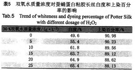 蠶蛹蛋白粘膠長絲按照1.3同浴法改性漂白工藝處理,改變雙氧水質量濃度,固定助劑WLS質量濃度20g/L,碳酸鈉質量濃度4g/L,硅酸鈉質量濃度2g/L,尿素質量濃度4g/L水洗、烘干后測白度。然后按照1.4工藝染色,測上染百分率。試驗結果見表5。