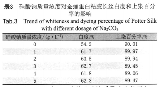 蠶蛹蛋白粘膠長絲按照1.3工藝同浴法改性漂白處理,改變硅酸鈉質量濃度,固定助劑WLS質量濃度20g/L.碳酸鈉質量濃度4g/L,尿素質量濃度4g/L,30%雙氧水質量濃度15g/L,水洗、烘干后測白度。然后按照1.4工藝染色,測上染百分率。試驗結果見表3。