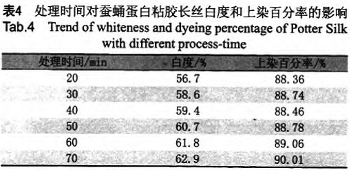 蠶蛹蛋白粘膠長絲按照1.3工藝進行同浴法改性漂白處理,改變處理時間,固定助劑WLS質量濃度20g/L.碳酸鈉質量濃度4g/L,硅酸鈉質量濃度2g/L尿素質量濃度4g/L,30%雙氧水質量濃度15g/L水洗、烘干后測白度。然后按照1.4工藝染色,測上染百分率。試驗結果見表4。