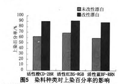 按照1.4染色工藝,改變染料種類,分別染未處理和改性漂白的蠶蛹蛋白粘膠長絲,測上染百分率,試驗結果見圖5。由圖5可知,不同種類的活性染料染蠶蛹蛋白粘膠長絲,同浴改性漂白蠶蛹蛋白粘膠長絲的上染百分率均比未處理的蠶蛹蛋白粘膠長絲高得多。但活性染料種類不同’結構不同,上染百分率提高幅度有所不同。