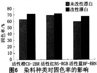 按照1.4染色工藝,改變染料種類,分別染未處理和改性漂白的蠶蛹蛋白粘膠長絲,計算固色率,試驗結果見圖6。由圖6可知,用不同種類的活性染料染蠶蛹蛋白粘膠長絲,同浴法改性漂白的蠶蛹蛋白粘膠長絲的固色率均比未處理的蠶蛹蛋白粘膠長絲高。但固色率提高程度與活性染料種類有關。