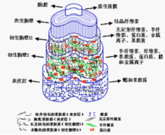 質、油蠟和蛋白質等組成。初生胞壁緊連表皮層,處于次生胞壁和表皮層之間,主要是纖維素的網狀組織,也含有一定數量的油蠟和果膠質等雜質。胞腔位于棉纖維中心,含有蛋白質、礦物鹽及一些色素等。顯然,棉纖維中的天然雜質主要集中于初生胞壁和表皮層中。