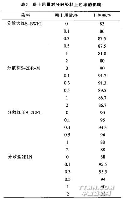 2 稀土在染色方面的應(yīng)用稀土最初是作為染色助劑在紡織上得以應(yīng)用的. 目前稀土染色助劑多是以高分子稀土絡(luò)合物、稀土氧化物或稀土鹽為主要成分的多組分、多功能染色助劑。其優(yōu)點(diǎn)在于:適應(yīng)性強(qiáng).能廣泛應(yīng)用于各種天然纖維、化纖及其混紡織物的染色;節(jié)約染料8%~20%.能取代全部或大部分染色助劑;改善環(huán)境.降低印染的污水排放量;提高勻染性和染色牢度:色澤鮮艷度提高、色光純正、手感柔軟,改善了織物外觀;有利于拼色染料的相容性,使拼混染料染色物色澤均勻,提高染色物的染色質(zhì)量。唐士誠等在滌綸及滌粘混紡織物的稀土染色方面做了較多的試驗(yàn)和研究.其中包括稀土用量對(duì)分散染