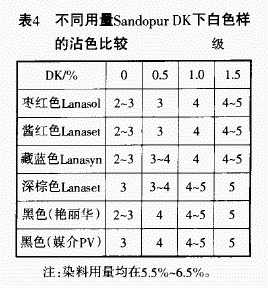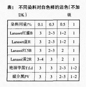 從表l、表2可看出,不加防染劑,織物著色明顯,加入SandopurDK 1%可顯著改善染料對白色織物的污染,起到了防止沾污的作用。另外,染料用量增大,污染增加,媒介黑染料會使紗線變黃。