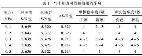 2.1.1軋車壓力的優選棉織物按照1.2.2工藝染色,然后按照1.2.3工藝進行固色處理,改變軋輥壓力,固定蛋白助劑用量20g/L,交聯劑WLS為12g/L,氫氧化鈉為6g/L.固色處理的織物水洗至中性,晾干后測試織物的K/S值和染色牢度,結果見表1.