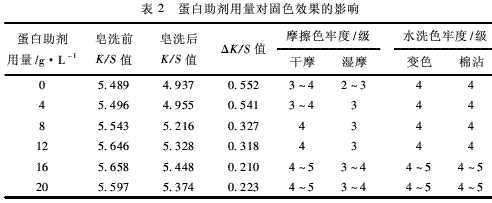2.1.2蛋白助劑用量的優選棉織物按照1.2.2工藝染色,然后按照1.2.3工藝進行固色處理,改變蛋白助劑用量,固定軋輥壓力為0.3MPa,交聯劑WLS為8g/L,氫氧化鈉為6g/L.固色處理的織物水洗至中性,晾干后測試織物的K/S值和染色牢度,結果見表2.