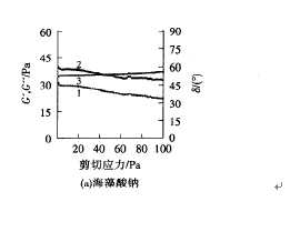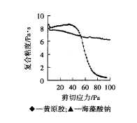 從圖3可知,海藻酸鈉和黃原膠糊料在剪切應力作用過程中,具有完全不同的粘度變化特征.受剪切應力作用的海藻酸鈉糊料復合粘度比較穩定,黃原膠糊料的復合粘度經歷了一個突變區.在高剪切應力(>80Pa)下,海藻酸鈉仍具有較高的復合粘度(6.5Pa·s),而黃原膠的復合粘度變得很小(0.4Pa·s).