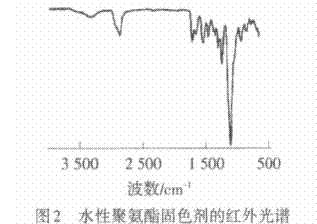 如圖2所示,3 340 cm-1處為N—H的伸縮振動峰;1 700 cm-1附近為CO—NH的C—O伸縮振動峰;1 500cm-1附近為CO—NH的N—H變形振動峰,這3個峰都是聚氨酯中氨基甲酸酯的特征振動峰,說明確實有氨基甲酸酯生成.1 600 cm-1附近為N—H的彎曲振動吸收峰;1 373 cm-1附近為與季銨正離子相連的CH2彎曲振動峰,說明水性聚氨酯存在—NH3;2 900 cm-1附近出現了C—H伸縮振動吸收峰;1 100 cm-1附近為水性聚氨酯中O—C—O的伸縮振動峰.以上特征峰說明,合成物質為水性聚氨酯.