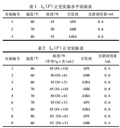 在帶有攪拌器、溫度計、滴液漏斗的100 mL三口燒瓶中添加30 g 60%的DMDAAC、9 g去離子水及0.6 mL 2%的亞甲基雙丙烯酰胺(交聯劑)、0.6 mL 1%的EDTA二鈉。升溫至60℃,加入0.75 mL 5.4%的聚合引發劑過硫酸氨水溶液,控制攪拌速度,60℃保溫聚合直至達到規定的粘度。表1、表2分別為合成工藝的條件及其變量正交表。
