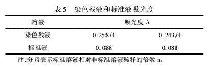 由圖1可知活性紅K-2G的λm2=510 nm和λm3=515 nm,并記下在最大吸收波長處染色殘液的吸光度,然后在最大吸收波長處測定其標(biāo)準(zhǔn)液的吸光度。所得結(jié)果如表5所示。