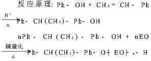 經研究,反應過程如下:在1000立升反應釜中吸入苯酚200公斤,并加入H2SO43.5公斤,打開回流,冷凝器,升溫至130℃,從高位槽滴加苯乙烯443.5公斤,溫度控制在130~135℃,大約1.5小時加完,然后升溫至140~148℃,保溫3小時,冷卻至60℃以下,加入液堿(30%)中和,再攪拌15分鐘即可。