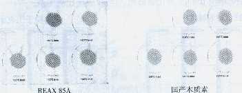 擴散法是目前檢測染料分散性最簡便快捷的方法,但有其局限性,無法與實際染色條件相對應(yīng),因此只能將其作為初步檢測手段.圖1中REAX 85A及國產(chǎn)木質(zhì)素在不同噴霧干燥溫度下,擴散性都可滿足要求.