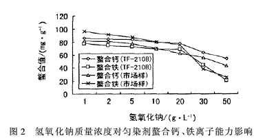 從圖2看,勻染劑市場樣及TF-210B對鈣離子、鐵離子均具有一定的耐堿螯合能力,兩者的螯合能力基本相當。氫氧化鈉質量濃度低于20 g/L時,堿用量對螯合力影響比較緩和,比較適宜常規(guī)的活性染料染色條件,且其螯合力也比較適中,不會對染料產(chǎn)生不良影響。