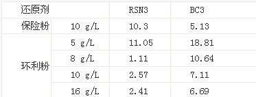注:RSN3:染料20g/L,BC3:染料20 g/L,RSN、BC均以保險粉(HS 3Og/L)為標準樣對比值。