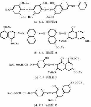 純棉半制品織物由TestFabricsInc.(WestPettsonPA,USA)提供,使用前采用AATCC標準洗滌劑WOB進行充分洗滌.C.I.直接紫51、C.I.直接藍71和C.I.活性橙16由Aldrich化學公司(Milwaukee,WI,USA)提供,C.I.活性紫16由Dystar染料公司提供.所有化學品未做進一步的提純,化學結構見圖1.實驗室合成的3種吡啶季銨鹽即4-氨基-十二烷基氯化吡啶(ALPC)、4-苯酰氨基-1-十二烷基溴化吡啶(BADPB)、4-(1-萘酰)氨基-十二烷基溴化吡啶(NADPB),其結構見圖1.