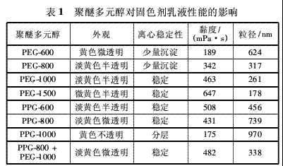選用不同相對分子質量的聚乙二醇(PEG)和聚丙二醇(PPG),制得一系列水性聚氨酯接枝改性多胺固色劑。聚醚多元醇對固色劑乳液性能的影響見表1。