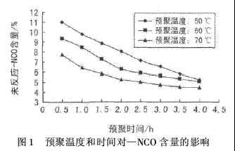 在合成聚氨酯固色劑預聚體時,選取—NCO基團與—OH基團的摩爾分數比(R值)為2.0,稱取45 g混合聚醚多元醇PPG-800和PEG-1000(摩爾分數比1∶2),則—NCO與—OH充分反應后,理論殘留—NCO的質量百分數為6.24%。測定—NCO基團的質量百分數與反應溫度和反應時間的關系,結果見圖1。