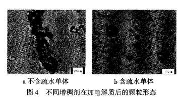 由圖4可以看出,未經(jīng)過(guò)疏水改性的增稠劑在加入電解質(zhì)后出現(xiàn)大塊團(tuán)聚,宏觀顯示出粘度大幅度下降,而經(jīng)過(guò)疏水改性的增稠劑在加入電解質(zhì)后,僅出現(xiàn)了小范圍的團(tuán)聚,宏觀表現(xiàn)粘度下降不多.表明疏水單體改善了增稠劑的耐電解質(zhì)性能.