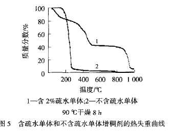如圖5所示,不含疏水單體的一般增稠劑在250℃左右迅速分解.當(dāng)體系中存在疏水單體時(shí),熱失重曲線發(fā)生明顯變化.在100℃以上開(kāi)始失重,其原因可能是長(zhǎng)鏈烷基位阻較大,對(duì)小分子的聚合有一定的阻礙作用,有殘留未聚合的單體小分子開(kāi)始熱解吸.從200℃到接近500cI二,對(duì)應(yīng)第一階段的熱分解,但分解的速度明顯比一般增稠劑緩慢,可能是長(zhǎng)碳鏈會(huì)對(duì)整個(gè)分子有包裹行為,對(duì)熱分解有一定的穩(wěn)定作用.之后,在500oC到900℃有一個(gè)相對(duì)穩(wěn)定的階段,也許是長(zhǎng)碳鏈的存在形成了某種相對(duì)穩(wěn)定相態(tài),這種特殊的現(xiàn)象有待進(jìn)一步研究.當(dāng)溫度進(jìn)一步升高(超過(guò)900℃)時(shí),結(jié)構(gòu)完全破壞而迅速分解.