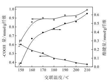 圖3交聯(lián)溫度對總的參與酯化反應的羧基量、殘留的羧基量以及酯鍵量的影響