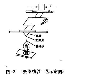 賽羅菲爾紡是由賽絡(luò)紡發(fā)展而來,即在賽絡(luò)紡紗中,用一根長絲取代其中的一根粗紗,兩者間距要大于賽絡(luò)紡的兩粗紗間距。由于成紗中含有長絲和短纖維兩種組分,又稱雙組分紗,當(dāng)短纖維為毛纖維時(shí),又稱Woolfil復(fù)合紗。