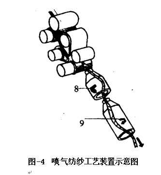 ①直接將熟條喂入到渦流紡紗機(jī)的牽伸機(jī)構(gòu),牽伸后的束纖維從前羅拉鉗囗輸出立即進(jìn)入與前羅拉鉗囗很近的螺旋形空氣噴管,被噴管中穩(wěn)定的渦流控制在一起,纖維束在噴管中向前運(yùn)動(dòng)到達(dá)噴管尾端并伸出到噴管咀的突出部分。
