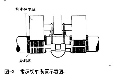 索羅紡紗技術(shù)是在賽絡(luò)紡和賽羅菲爾紡的基礎(chǔ)上發(fā)展起來的一種新型紡紗方法。該技術(shù)的是在細(xì)紗機(jī)前羅拉下方加裝一表面有許多溝槽的分割輥,見圖3所示。能對細(xì)紗前鉗囗輸出的須條進(jìn)行分劈,產(chǎn)生若干根窄條,由于捻度的傳遞,這些窄條帶有少量的捻度,再被匯合加捻后,形成類似多股線(纜繩紗)的索羅紡紗。