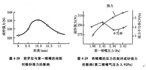 圖4—29表示第二噴嘴壓力為3.92Pa時,第一噴嘴壓力與成紗強力的關系。紡紗線密度為13tex滌/棉(65/35)。