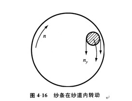 須條從吸口進入紗道內,在高速旋轉的渦流場作用下,受氣流推動旋轉而加捻。由于紗條密度ρy遠大于空氣密度,在離心力作用下,紗條向外側運動,到達離心力(向外)與渦流場壓差(向內)的平衡位置(即靠近管壁)時,紗條旋轉方向與氣流旋轉方向相同(公轉)而加捻,如圖4—16所示。