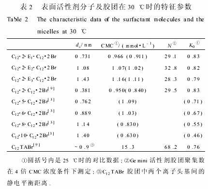 式中:S1和S2分別為電導(dǎo)曲線在CMC之下和之上的直線的斜率,對溴反離子其摩爾電導(dǎo)率λBr-=7814Ω-1·cm2·mol-1。膠團表面反離子結(jié)合度K0=1-α,表2給出30℃時Gemini膠團的K0值。與C122C12·2Br相比較,聯(lián)接鏈上增加了1個EO基團,K0值不變。當(dāng)n從1增加到3,K0值逐漸下降,這與C12sC12·2Br系列的K0變化趨勢一致。頭基距離增大使其電荷密度下降,因而K0減小。但當(dāng)ds值相近時,例如C122E3C12·2Br與C1210C12·2Br,前者K0明顯大于后者。親水聯(lián)接鏈造成的膠團表面頭基區(qū)環(huán)境更有利于吸引水合反離子,從而使K0增大。這也應(yīng)是C122E1C12·2Br與C122C12·2Br具有相同K0的原因。