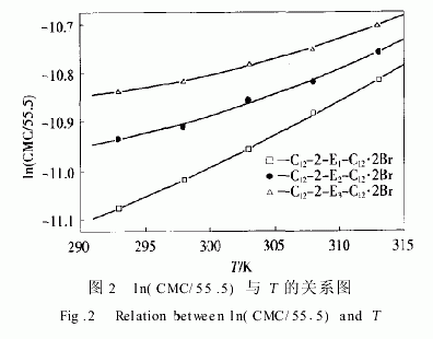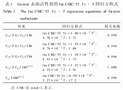 Islam指出普通離子型表面活性劑的ln(CMC/555)~T曲線通常呈現U形狀[10]。圖2顯示C122EnC12·2Br的ln(CMC/555)隨T上升而增大,這和C122C12·2Br以及C12TABr的趨勢一致[11],表明所考察的溫度范圍在U形曲線的右邊,回歸方程列于表3。