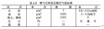 噴氣引緯使用的壓縮空氣必須是無水、無油,滿足噴氣引緯壓力和溫度要求的潔凈空氣,噴氣引緯用壓縮空氣的標準如表2-5所示。壓縮空氣中過量的水分、油分和雜質對引緯系統及供氣管道會造成嚴重危害:機器及供氣管道銹蝕;供氣管道等粘著灰塵等異物,使管內空氣阻力增加,壓力損失增加,嚴重時會逐漸堵塞輔助噴嘴的出氣小孔或使閥門失靈,影響噴氣引緯的正常進行;污染鋼筘,使引緯狀態惡化,引緯效率下降,影響織物質量。過量的油分還會污染織物,影響工作環境。