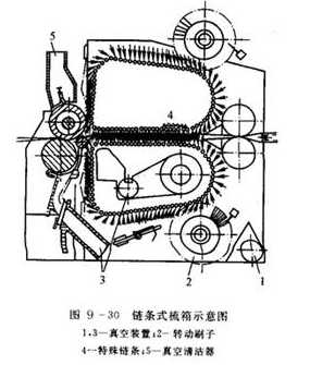 根據針排傳動方式的不同,又可分為螺桿式、鏈條式和回轉頭式3種。圖9—29所示為螺桿式的針梳機。圖9—30所不為鏈條式針梳機的示意圖,