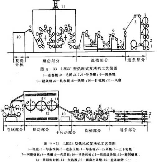 復洗機一般均包括進條、洗槽、烘房和輸出四個部分。按烘干方式的不同可分為兩種形式:一種是熱輥式,如LB33l型;另—種是熱風式,如LB334型。見圖9—33和圖9—34。