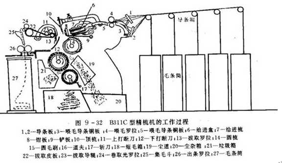 圖9—32為目前應用最廣泛的國產B311C型精梳機的工作過程簡圖。