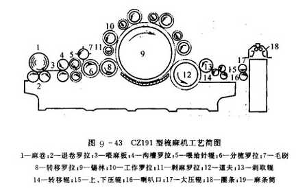 圖9—43所示為CZl 91型梳麻機的工藝簡圖。主要由喂人預(yù)梳部分、錫林部分、剝麻與成條部分組成。