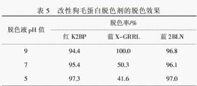 由圖5可知,當(dāng)pH值超過(guò)4時(shí),脫色率有所下降,原因是:溶液的酸性較強(qiáng)時(shí),蛋白質(zhì)水解顯著,分子質(zhì)量降低,溶解度增大,對(duì)染料的吸附沉降能力降低,很難起到脫色作用;當(dāng)pH在4左右時(shí),改性狗毛蛋白帶有一定量正電荷并處于等電點(diǎn)附近,蛋白質(zhì)大分子發(fā)生了較少的降解,蛋白質(zhì)溶解度小,脫色效果較為理想.綜合考慮,脫色液pH值選擇4左右,此時(shí)脫色率為97.4%.
