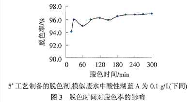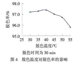 從圖3可以看出,30 min時(shí),脫色較為充分,脫色率達(dá)到較佳值,之后,隨著脫色時(shí)間的延長(zhǎng),脫色率變化不大.為了省時(shí)、節(jié)能,選取30 min為其最佳的脫色時(shí)間,此時(shí)脫色率可達(dá)到96.0%