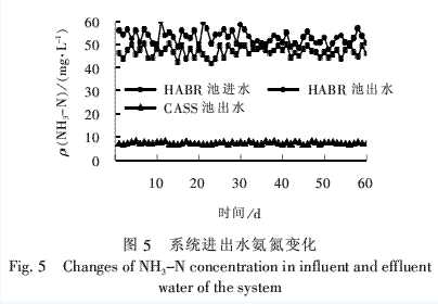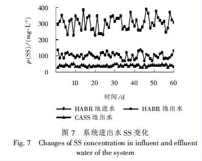 HABR厭氧池具有獨特的分室結構,反應器內的折流板迫使水流上下折流,使廢水與厭氧微生物充分接觸,大量的懸浮物在前面隔室中被有效去除,故SS去除率較高。由圖7可知,雖然HABR厭氧池進水SS濃度波動較大,但其出水SS平均質量濃度穩定在100.3 mg/L,對SS的平均去除率為66.9%。CASS反應池在沉淀階段停止曝氣,只有進水而無出水,曝氣結束后沉淀階段整個反應池的面積均用于在近乎靜止的環境中進行泥水分離,故其固體通量很低,泥水分離效果良好。CASS反應池對SS的平均去除率為62.1%,出水SS平均質量濃度穩定在38.0 mg/L。系統對SS的總體去除率達到87.5%。