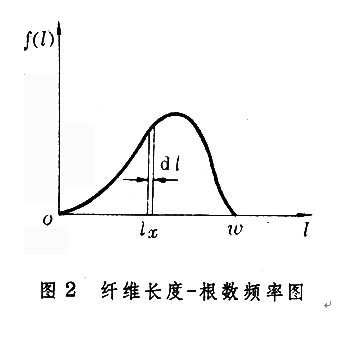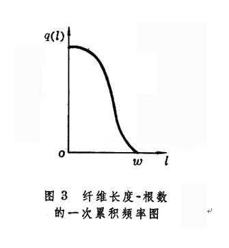 纖維按長度排列時表達其累計根數和長度的坐標圖,如用拜氏纖維長度分析器反方向排圖并轉動90°時,即得到相近于纖維長度的一次累積頻率圖。以橫軸表示纖維長度,縱軸表示某一長度纖維的累計根數百分率q(□),即得纖維長度-根數的一次累積頻率圖(圖3纖維長度-根數的一次累積頻率圖), q(□)曲線為一次累積頻率曲線,□表示纖維的總長度,纖維的根數平均長度為□,由于q(o)=1,故□代表纖維的根數平均長度。
