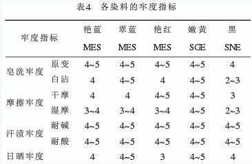 在選用改進工藝II條件下的各類染料的牢度指標(biāo)見表4(代用堿用量:3g/L,染料質(zhì)量濃度:黑60g/L,其它染料10g/L)。試驗結(jié)果表明,代用固色堿劑的各項牢度指標(biāo)均在3級以上,日曬牢度都很高,均滿足商品要求,可以在大車生產(chǎn)中代替純堿。
