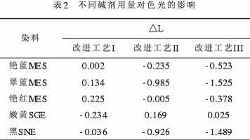 由表2可以看出:與常規(guī)工藝比較,單獨使用代用堿固色的改進工藝II、III△L值多為負值,色樣均