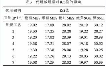 為了進一步優(yōu)化改進工藝II的代用堿劑使用量,對該參數(shù)進行優(yōu)化,以研究不同染料在不加燒堿的條件下,采用不同代用堿劑用量情況下產(chǎn)品的K/S,見表3。
