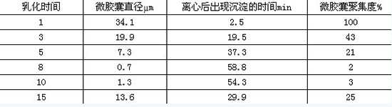 乳化液要有一定的穩(wěn)定性需要合適的乳化時間,如果乳化剪切時間太短,則可能剪切攪拌不夠充分,乳化液沒能完全乳化;但是,如果乳化剪切時間過長,則會發(fā)生破乳現(xiàn)象。由實驗結果可知,當采用8min乳化剪切時間時,形成的乳化液已較為穩(wěn)定,制成的微膠囊的直徑較小,分布較為均勻。